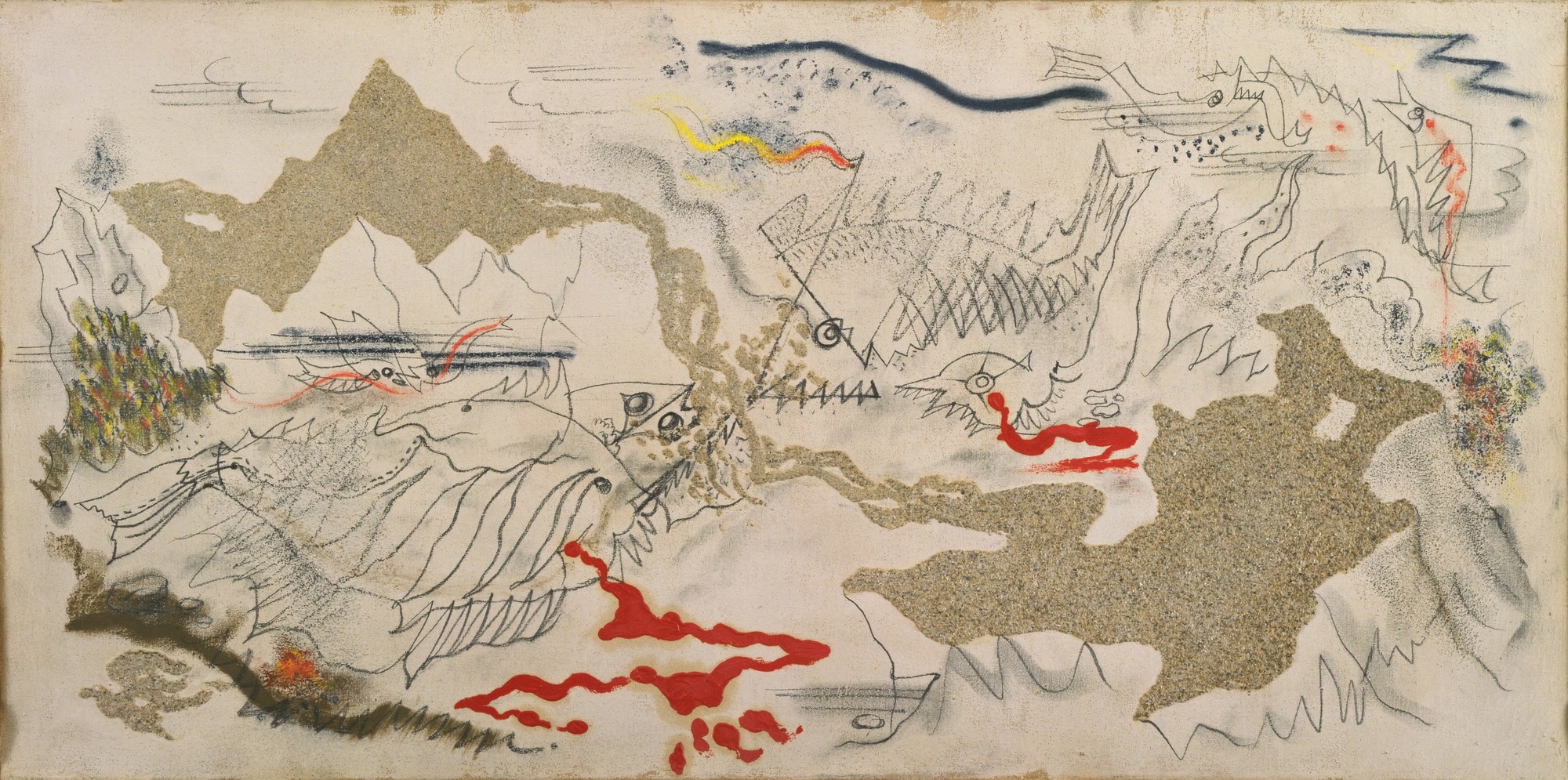 In André Masson’s ‘Battle of Fishes’ (1926), he explored the use of automatism in which he embraced the elements of chance in the unconsciousness to produce a surrealist painting. He had used gesso and let it freely fall across his canvas before throwing sand over it to doodle and paint around the resulted form. What came out of the unexpected result features two prehistoric fishes, jaws dripping with blood: an unconscious demonstration of the inherent violence of nature (Mann).
