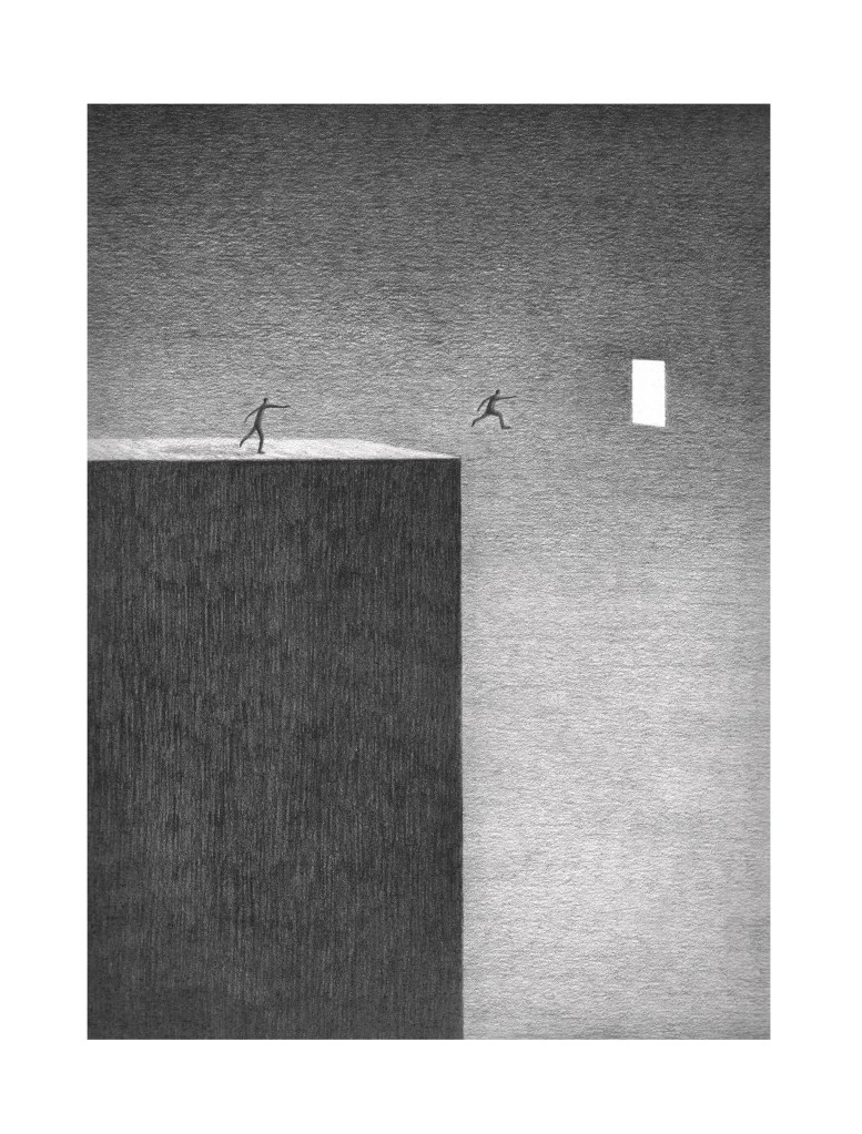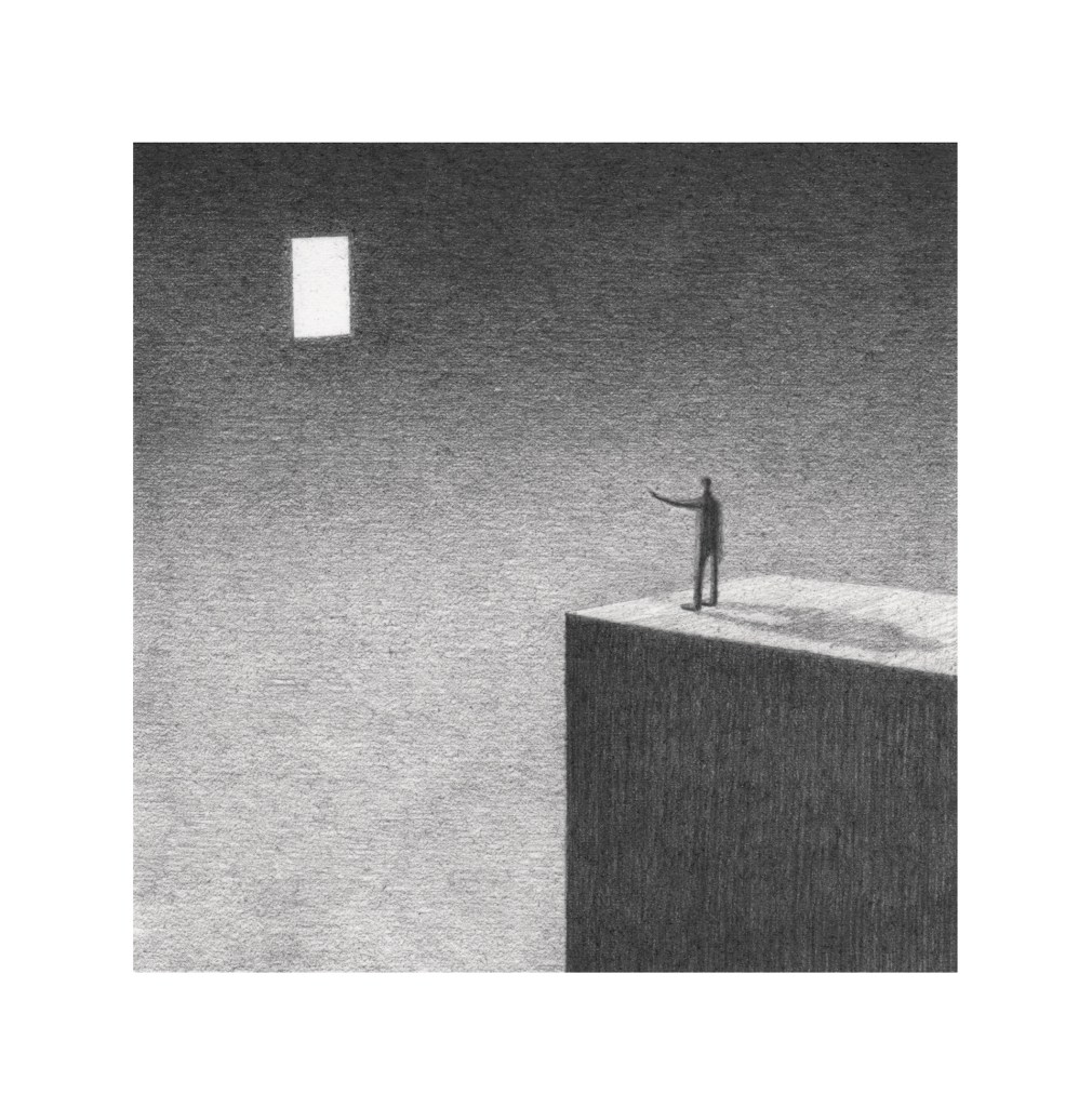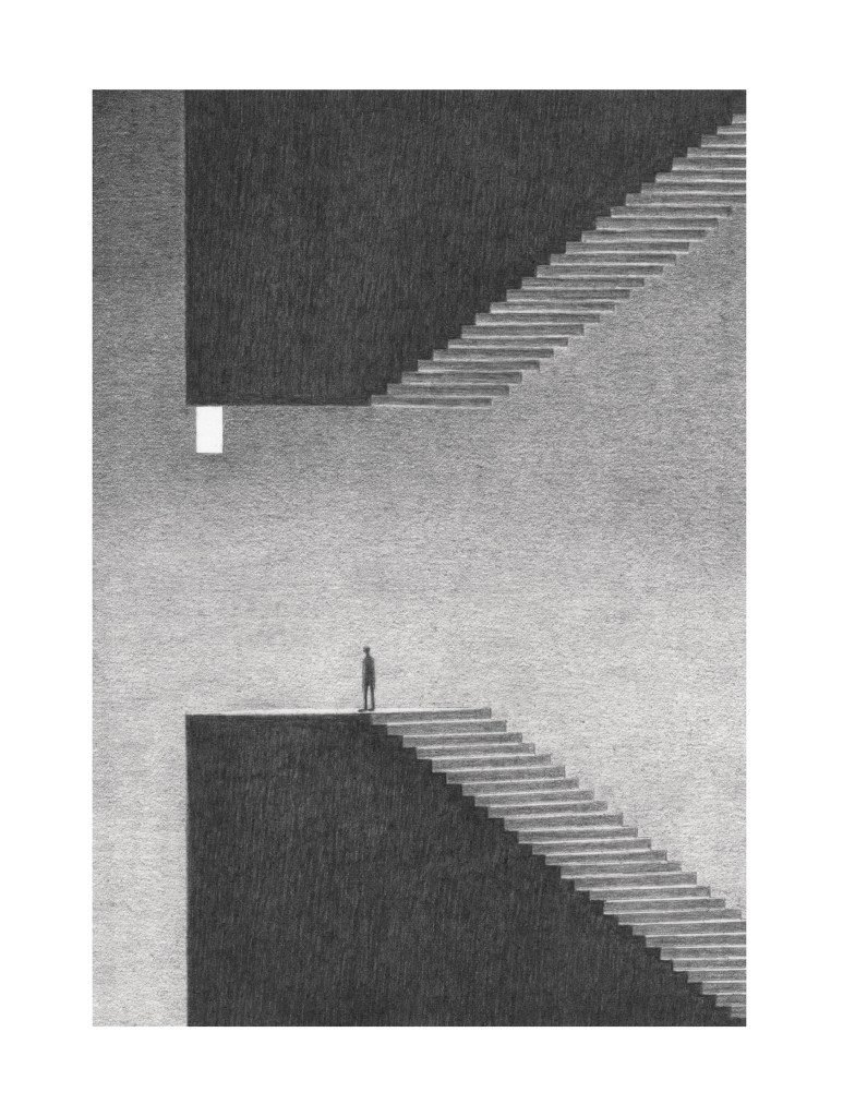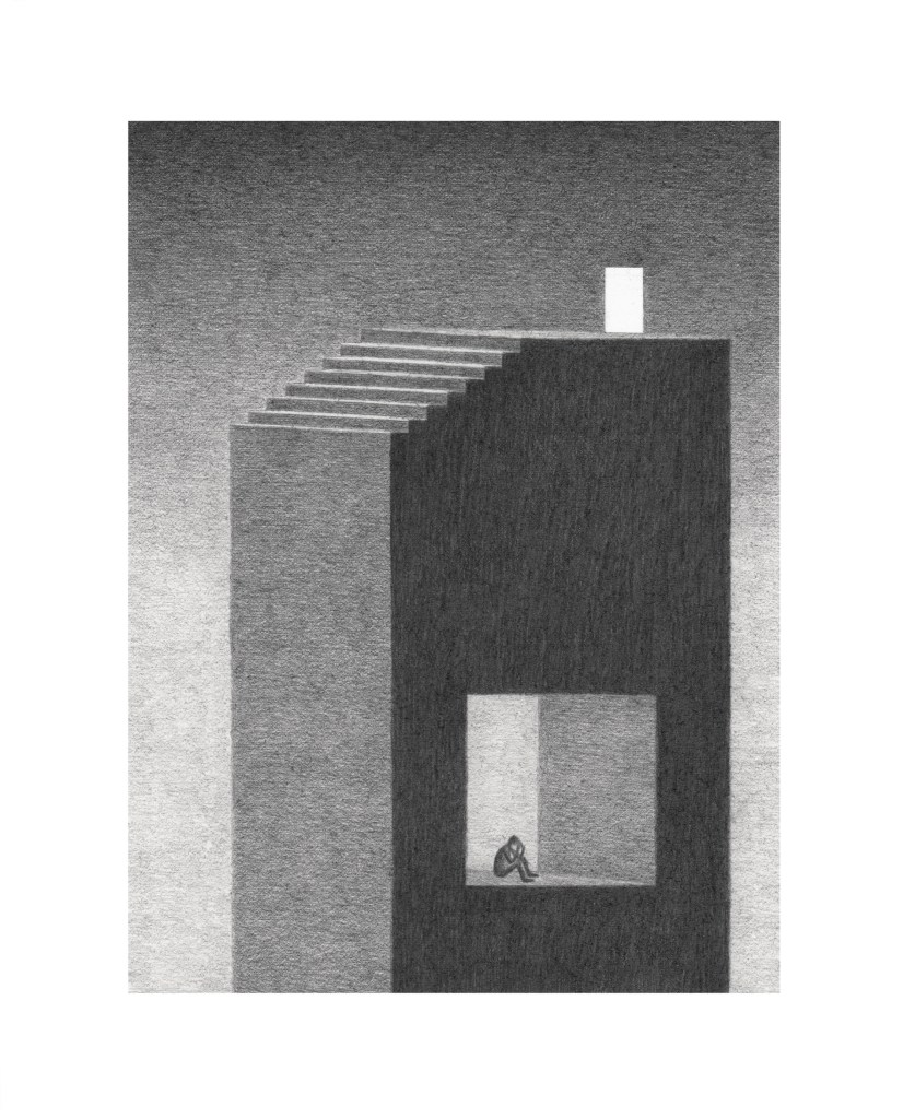 ‘In the Future, We Lose Contact’ (2019) was an artwork that he pieced together as a series under Surrealism and Contemporary art. Created purely out of pencil and graphite, he again uses elements of monochromes to elicit the expressions of mystery, horror and fear of the unknown. The illustrations feature images of tall, open structures, with human figures separated from one another or from an opening of a lighted door – of what may seem to be a representation of opportunity.