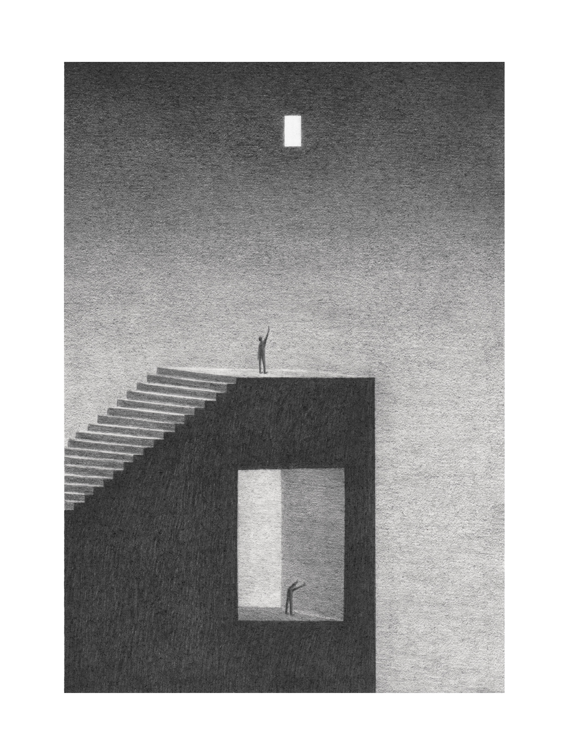 Most of the illustrations show an unrealistic mean of getting to the ‘opportunity’, or the lighted door: the distance is too far; there is no staircase or mean of getting to the top; there is an obstacle ridiculously huge and impossible to get rid of. The expression of immense frustration is evident in his series of illustrations.